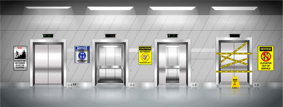 AI-generated image of four elevators with various signage about evacuation, one is out of service.