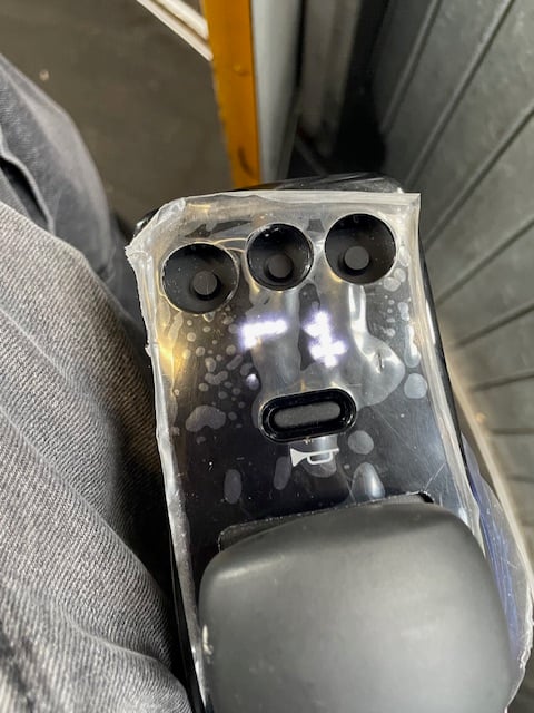 Picture of a Whill CI Model 2 wheelchair joystick with the protective plastic still attached. The LED display, which is supposed to show the amount of battery remaining and speed, has 1/3 of the pixels blacked out and non-functional. The button panel has been ripped out because the hard plastic top was peeled back, which requires significant force.